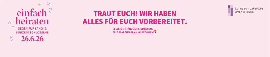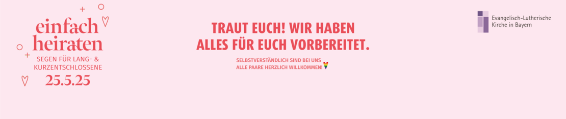 Glücklich zu zweit, aber mit der kirchlichen Hochzeit hat es noch nicht geklappt? Vielleicht zu aufwendig, zu teuer, zu kompliziert? Jetzt ist eure Chance: Einfach Heiraten! Sagt ja zueinander und erhaltet Gottes Segen für eure Partnerschaft - ganz unkompliziert in der evangelischen Christuskirche in Neumarkt. Egal ob schon seit 30 Jahren, noch gar nicht oder ganz frisch standesamtlich verheiratet: Kommt vorbei!