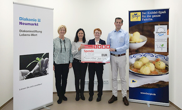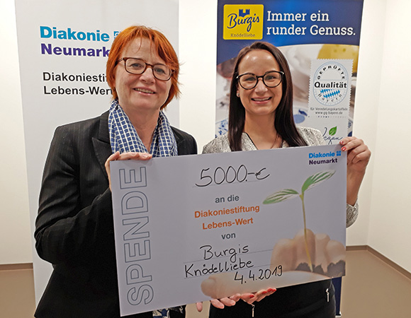 Das Familienunternehmen Burgis aus Neumarkt in der Oberpfalz fühlt sich seinen Wurzeln eng verbunden, was sich auch in dem Engagement des Knödelspezialisten in der Region äußert. Mit der „Diakoniestiftung Lebens-Wert“ arbeitet Burgis seit Anfang 2017 erfolgreich zusammen und das soll auch fortgeführt werden. Im Rahmen dessen wurde von Julia Fersch, Leiterin Marketing, im April 2019 ein Scheck in der Höhe von 5.000 Euro an die Vorsitzende der Stiftung Dekanin Christiane Murner überreicht.