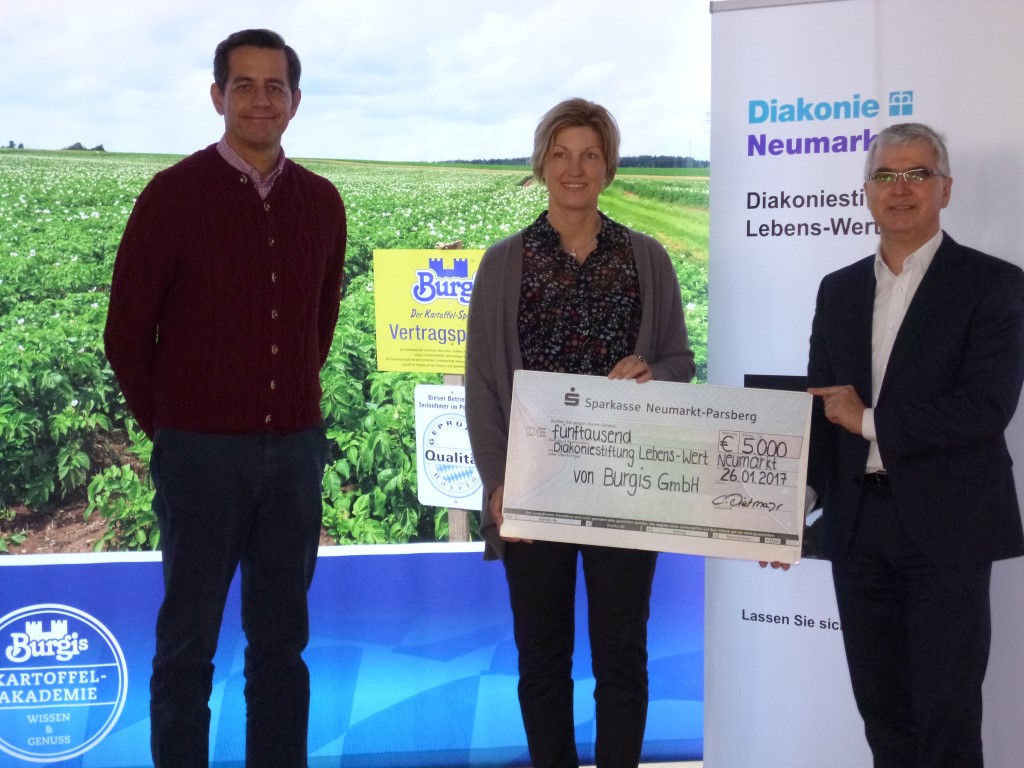 Vertreter des Neumarkter Familienunternehmens und der Diakonie Neumarkt haben das gemeinsame Engagement am 26. Januar 2017 offiziell bekanntgegeben. Außerdem hat die Geschäftsführung Christina Dietmayr und Timo Burger an Diakonievorstand Detlef Edelmann eine Spende in Höhe von 5000.- Euro übergeben.